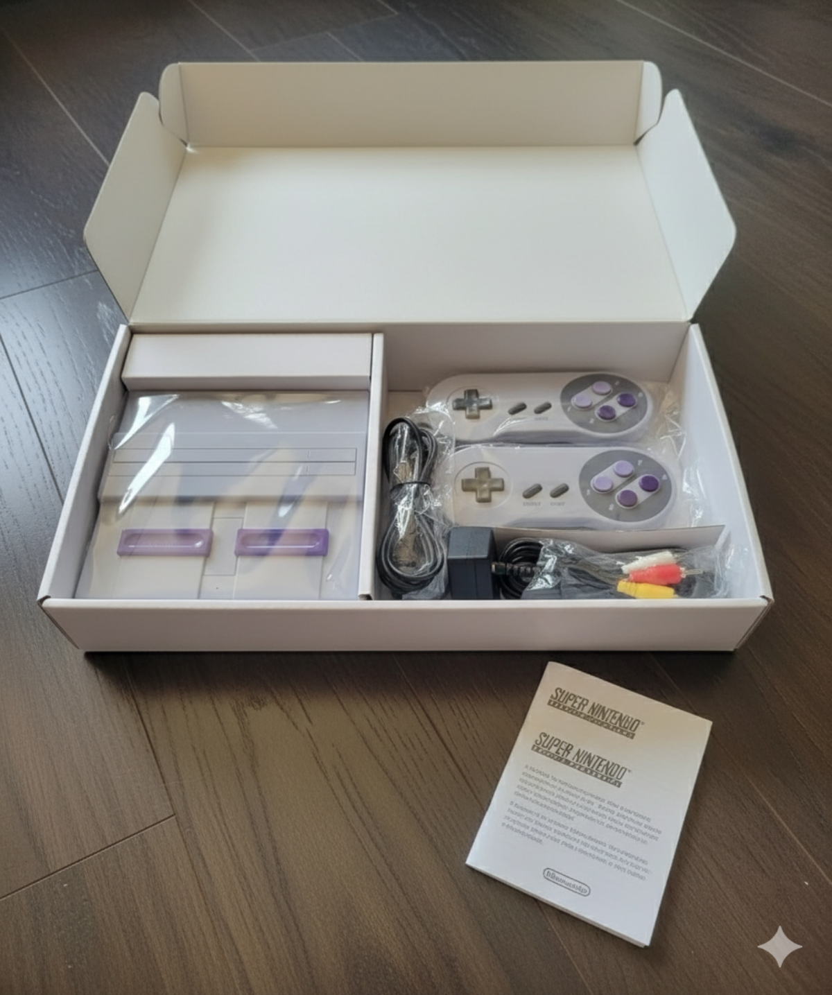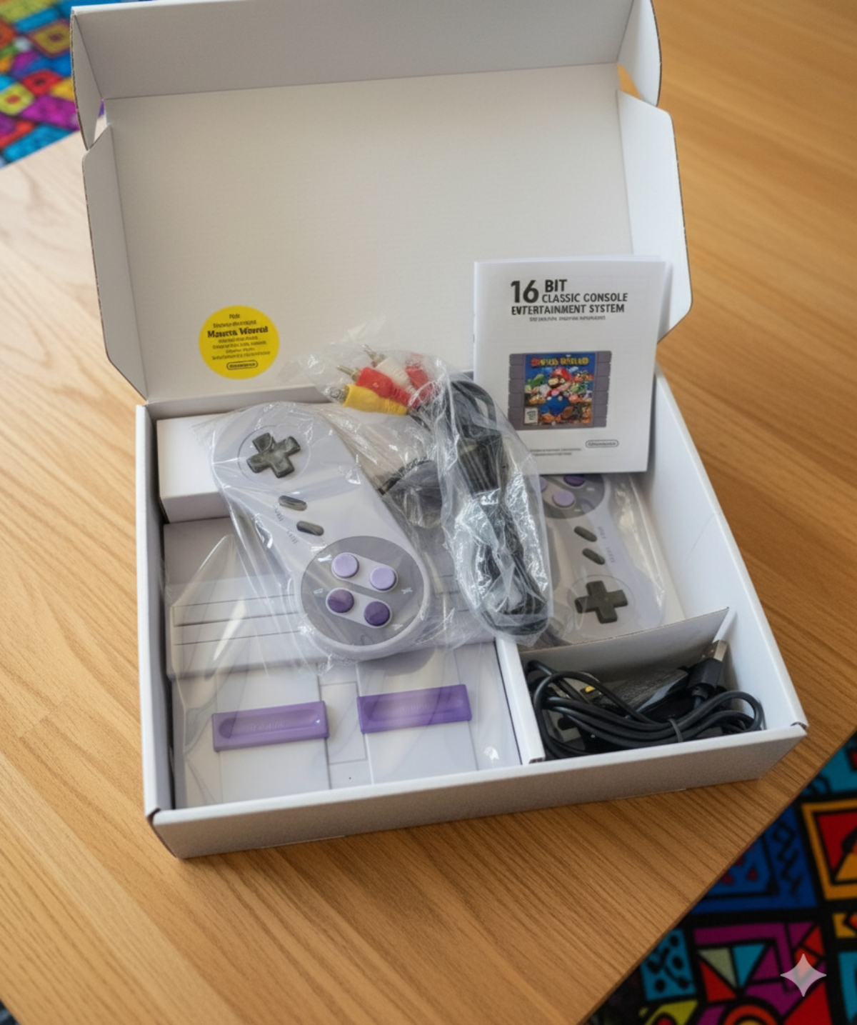 ๐ฆ 1x Brand New 16-Bit SNES Replacement Console (Mini-sized, high-quality build) ๐ฎ 2x Corded Controllers (Responsive, full-size) ๐บ 1x AV TV Connection (3-prong cable, works with modern TVs) ๐ 1x AC Power Cord/Plug ๐ 1x User Manual ๐ Retail Packaging (Perfect for gifting!)