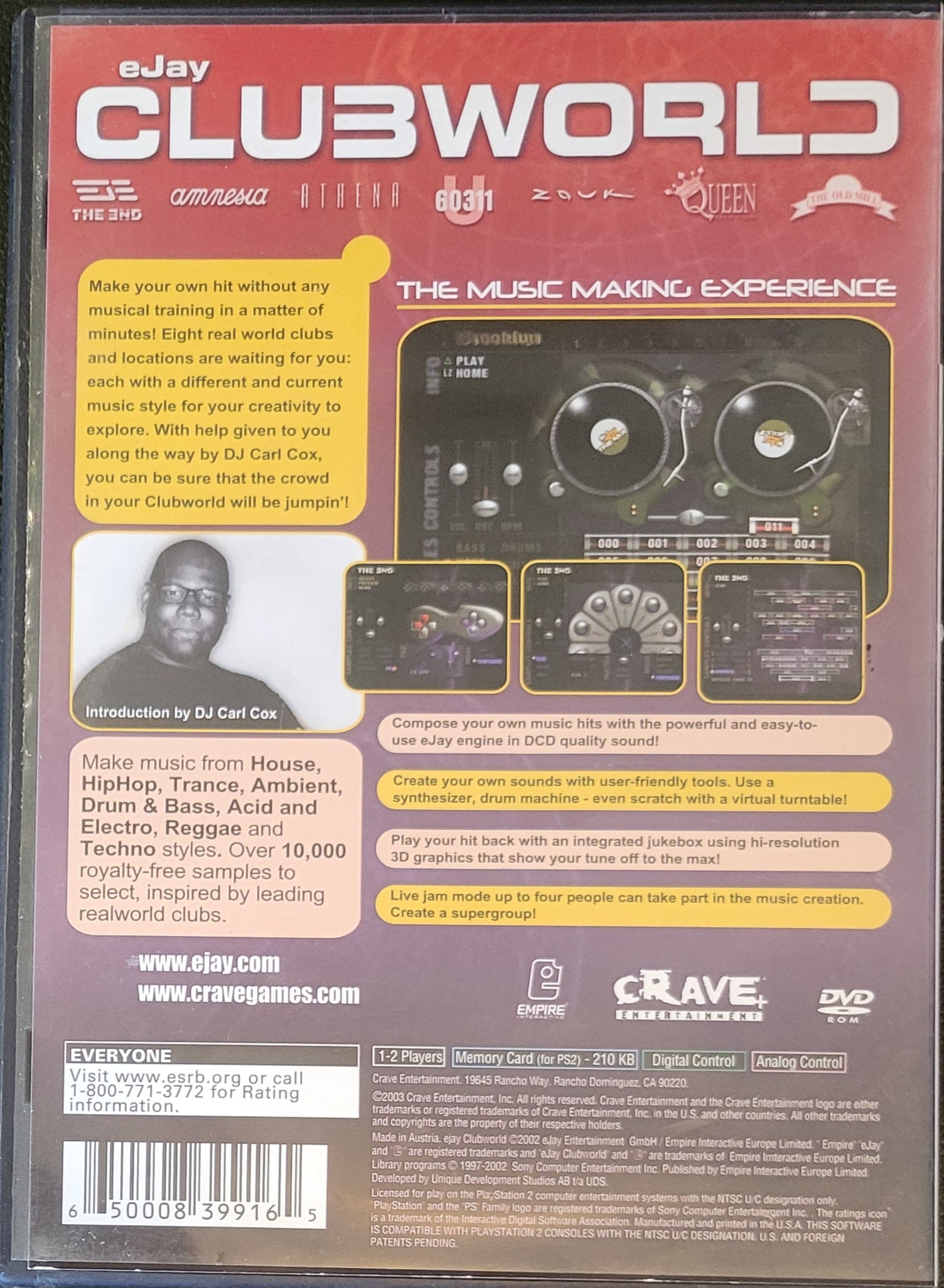 Welcome to ClubWorld, the ultimate nightlife simulation on the PS2! Design, build, and manage your own dance club — from lighting and decor to DJ selection and music. Featuring real club tracks from Ministry of Sound, it's a unique blend of creativity, rhythm, and management set in an electrifying virtual nightlife environment.