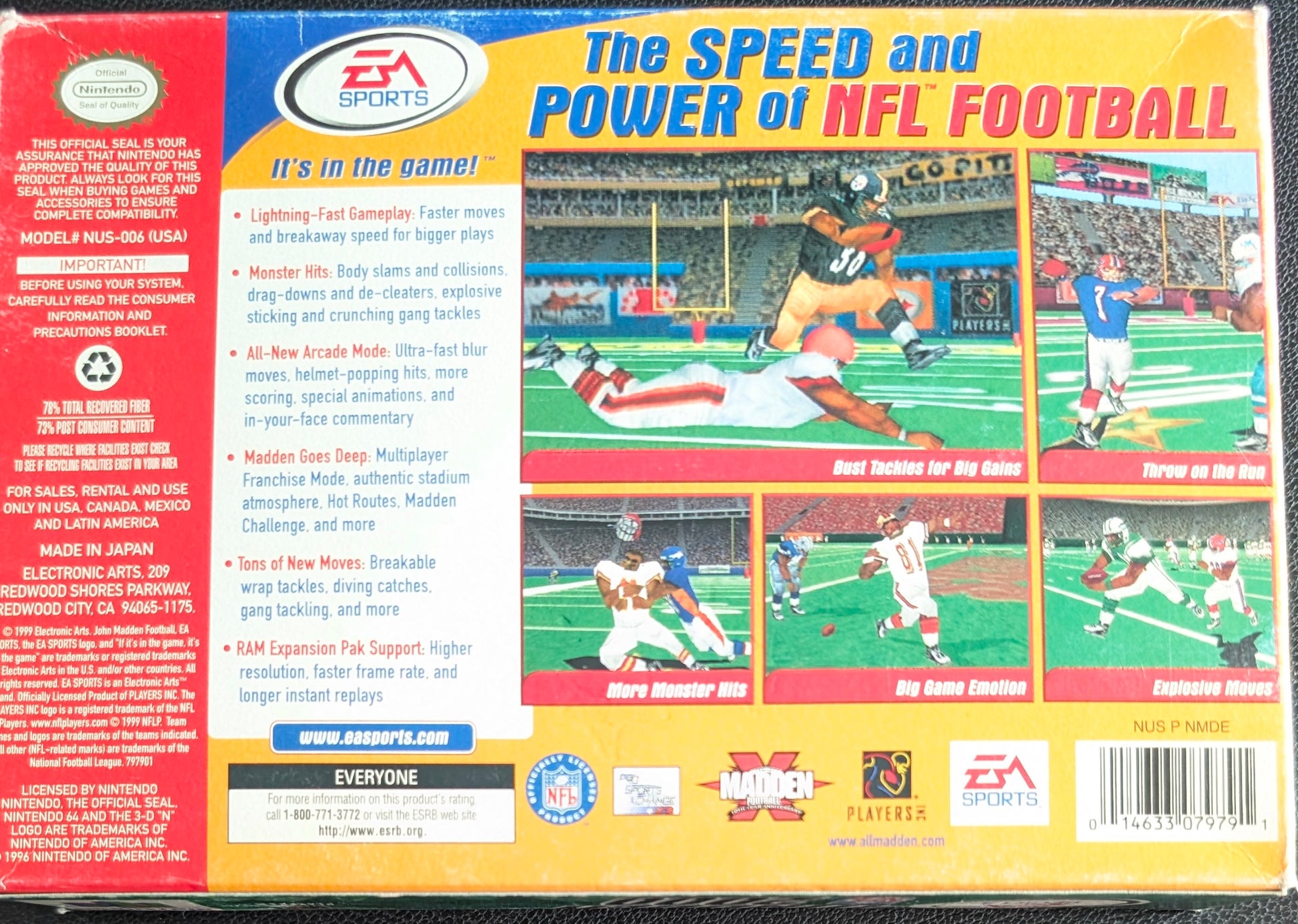 This authentic Madden NFL 2000 for the Nintendo 64 (N64) is complete in box and includes the original cartridge, box, manual, and a protective plastic sleeve. The game has been thoroughly cleaned and fully tested to ensure smooth, reliable gameplay. A great addition for sports fans and N64 collectors alike.