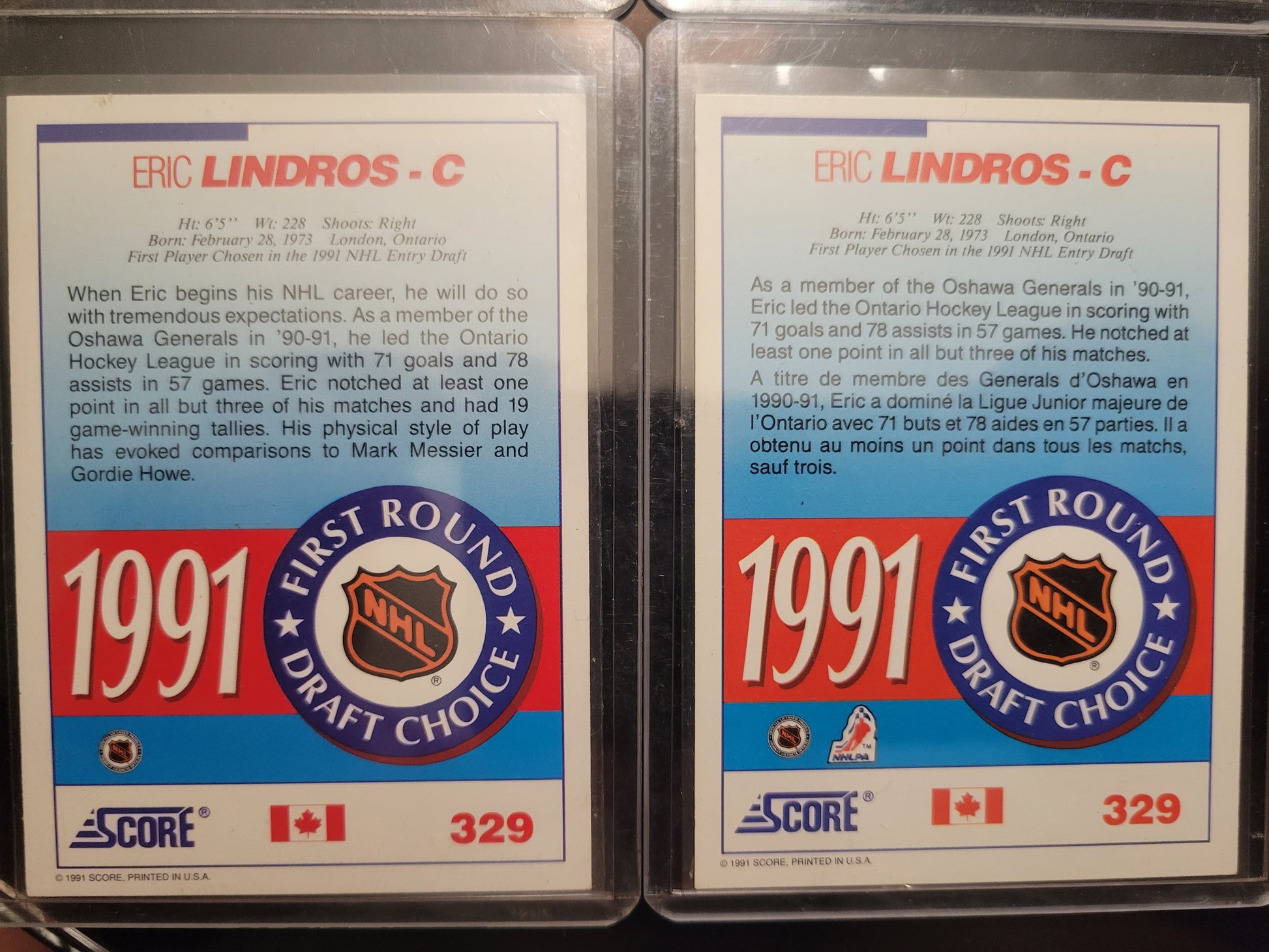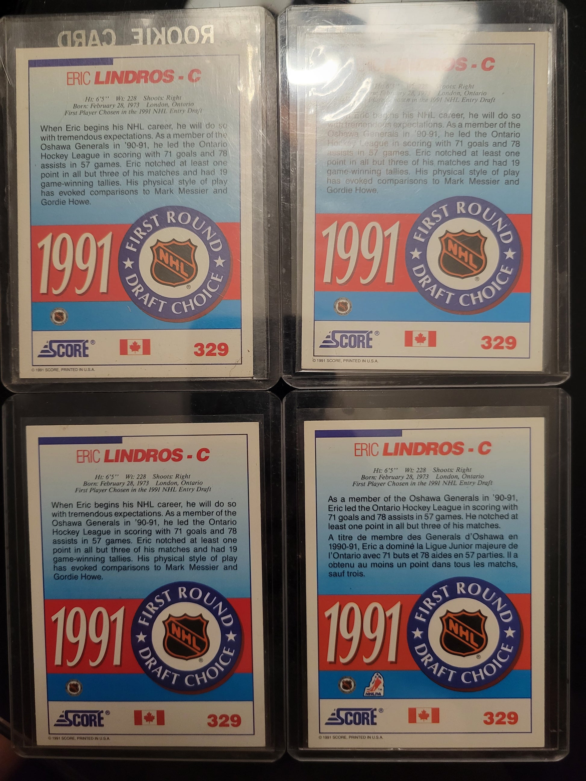 This lot includes four mint condition Eric Lindros rookie cards from the 1991 Score series. Each card has been kept in a soft sleeve and top loader since new, ensuring their quality. A fantastic addition for any hockey card collection, featuring one of the sport's legendary players.