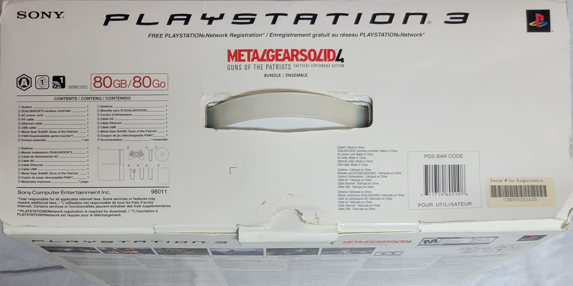 This is the official Limited Edition Metal Gear Solid 4 PS3 Slim console bundle, released in extremely limited quantities. It comes Complete in Box (CIB) and includes everything originally packaged, including:
